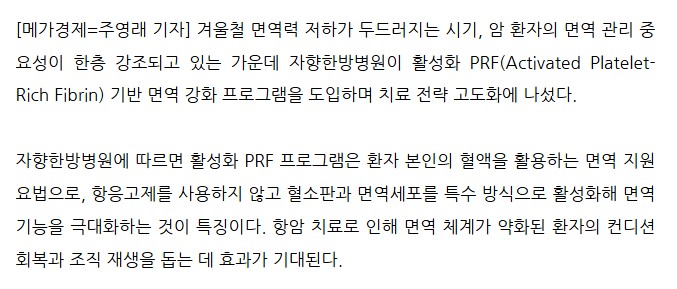 ÀÚÇâÇѹ溴¿ø, Ȱ¼ºÈ PRF ±â¹Ý ¸é¿ª ÄÉ¾î µµÀÔ¡¦¾Ï ȯÀÚ ¸é¿ª ȸº¹¡¤»îÀÇ Áú °³¼± ±â´ë